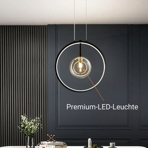 Diese Pendelleuchte: modern-minimalistisch. Großer Kreis, transparente Glaskugellampen, reine Linien, ohne Überflüssiges.